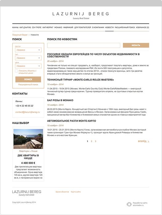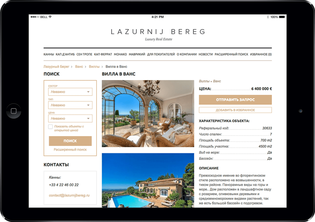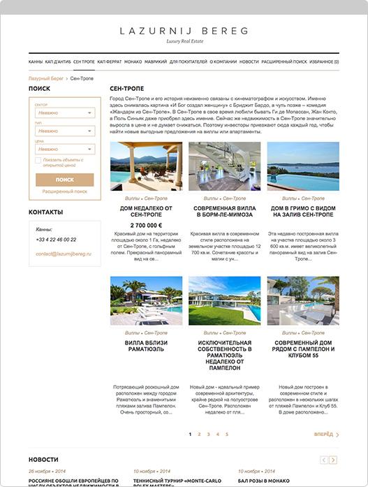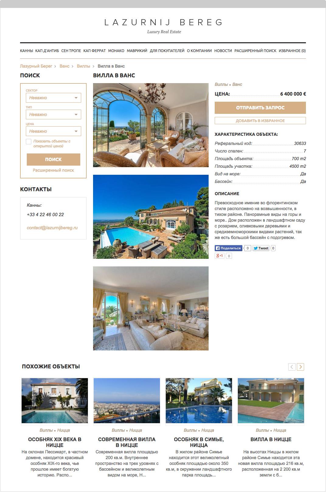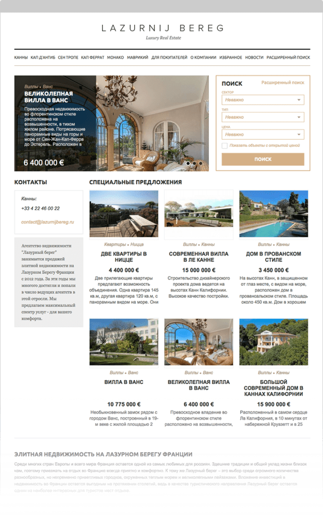 Accent is made on convenient display of information about apartments, houses and villas with French Riviera. In addition, in the updated version of the site there is an extended catalog search.
