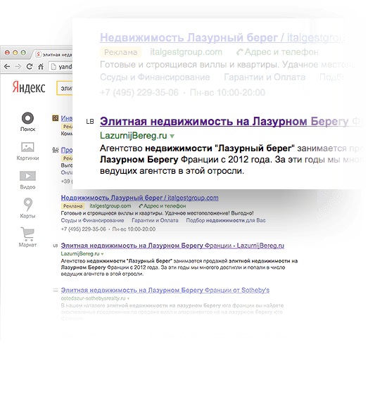 The main task is– to attract people from Yandex and Google search who want to buy elite real estate on French Riviera.