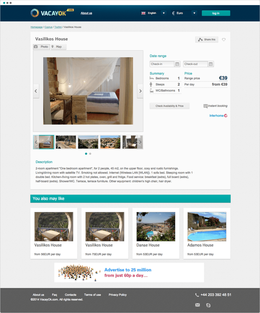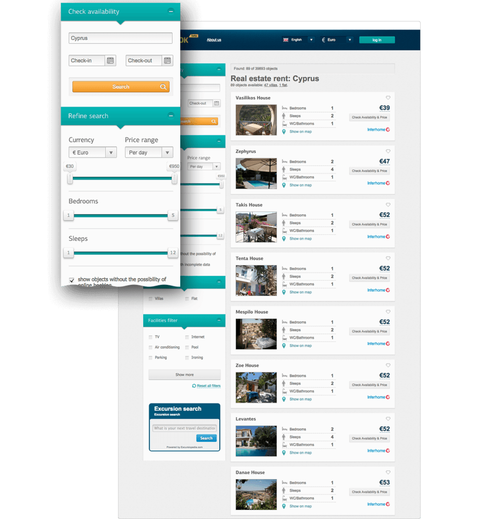 The main feature of the project – connection to the world apartment reservation systems. Home Away, Interhome, Apartments Apart, Laterooms, Holiday Velvet and Way To Stay were connected at first.
