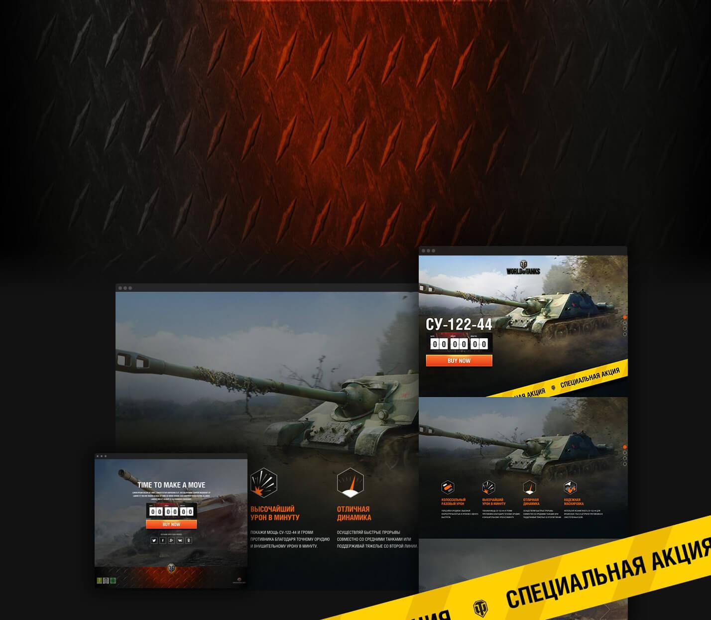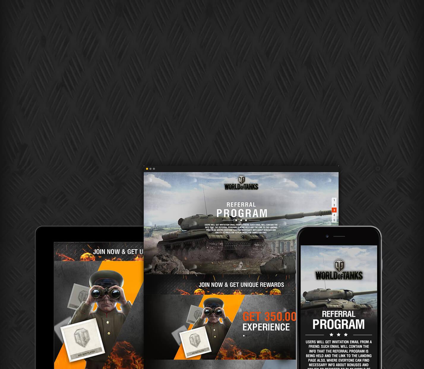 Promotional landing page for the affiliate program of World of Tanks Deliverables: design, programming, adaptive development, testing